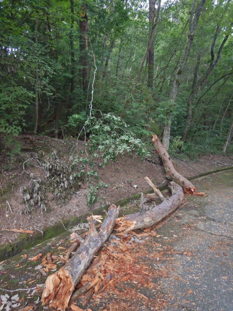 丸山湿原の駐車場傍に、ナラ枯れの大木と駐車場進入路の松枯れ伐採(2025-7)